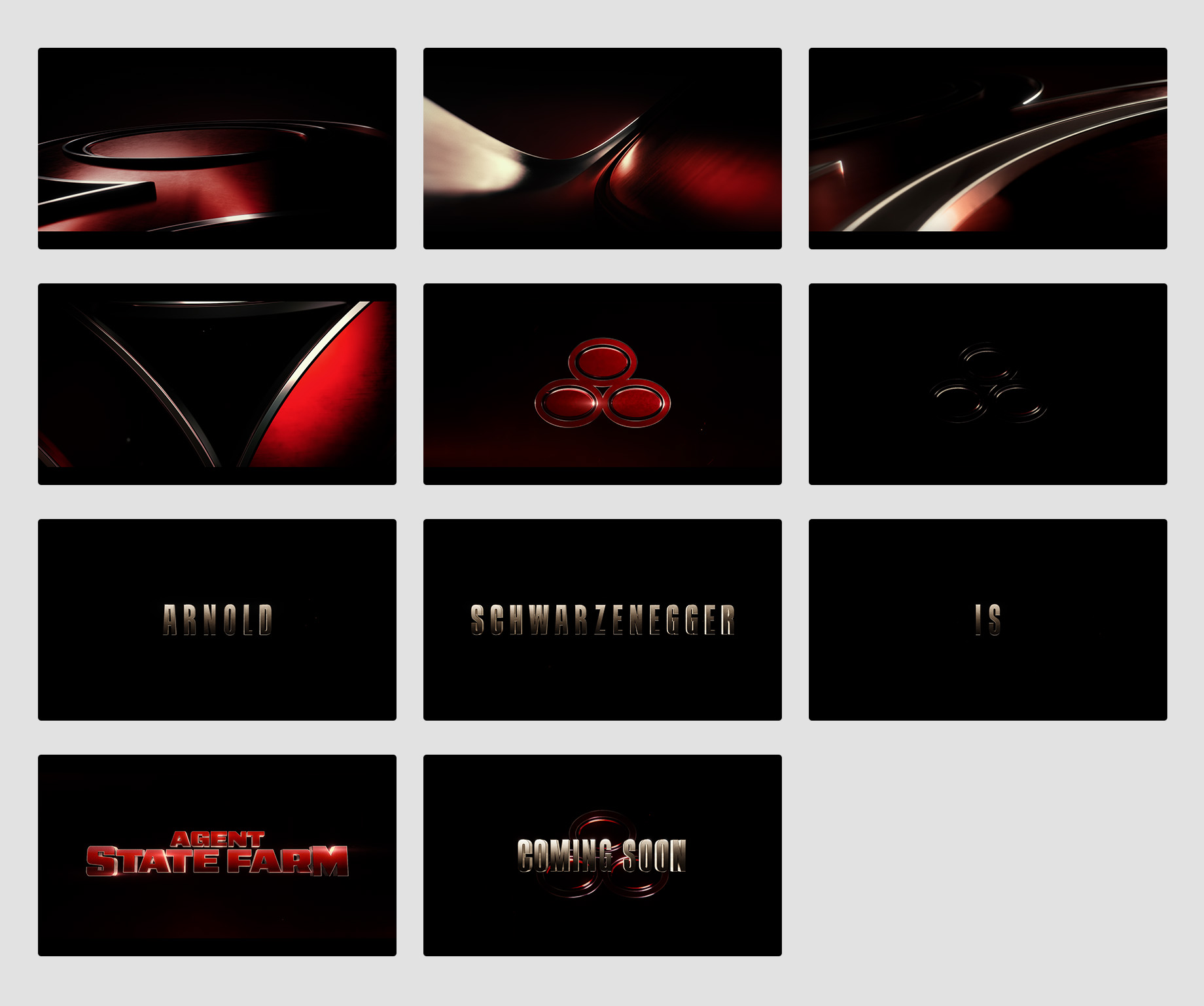 Finally, we designed a complementary type system to introduce Arnold and, of course, let viewers know when to expect the film. This type design centered around a condensed typeface in order to fit SCHWARZENEGGER on the screen with maximum impact and a metallic treatment that maximized legibility while also feeling related to the materials in the main Agent State Farm title.