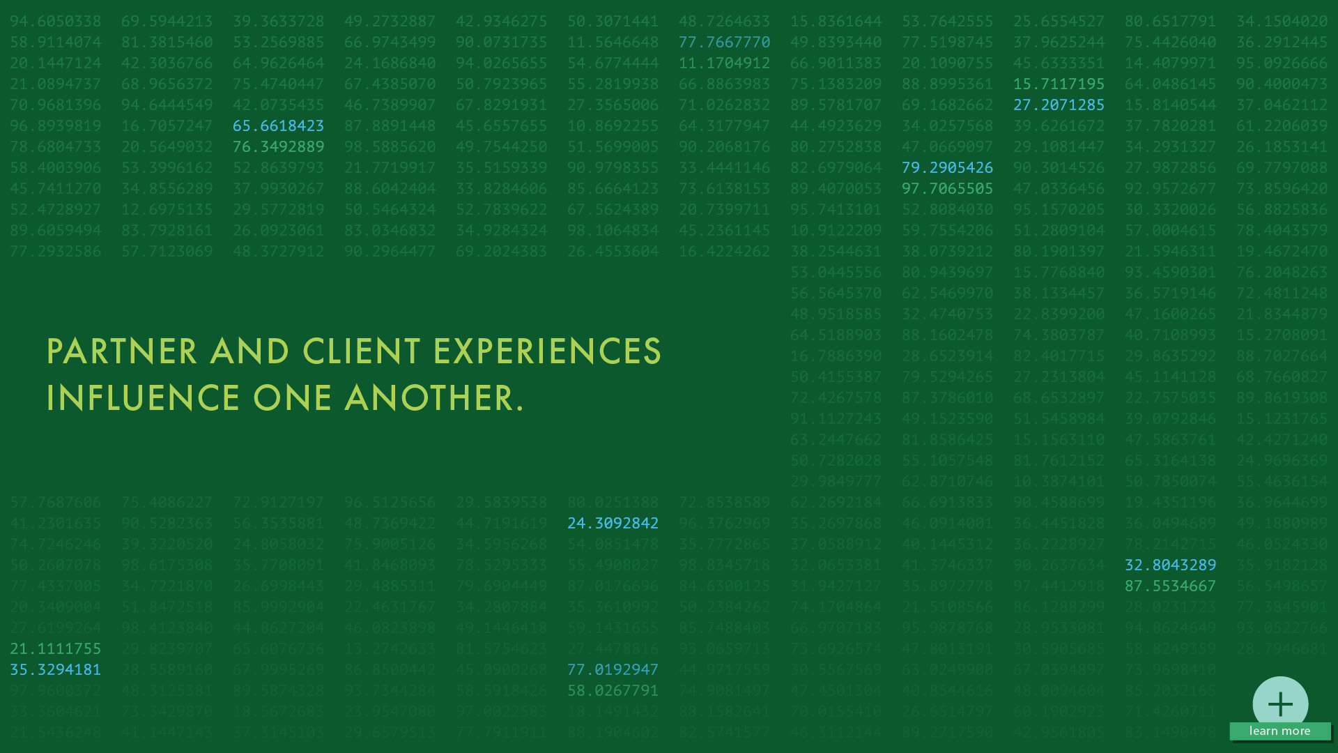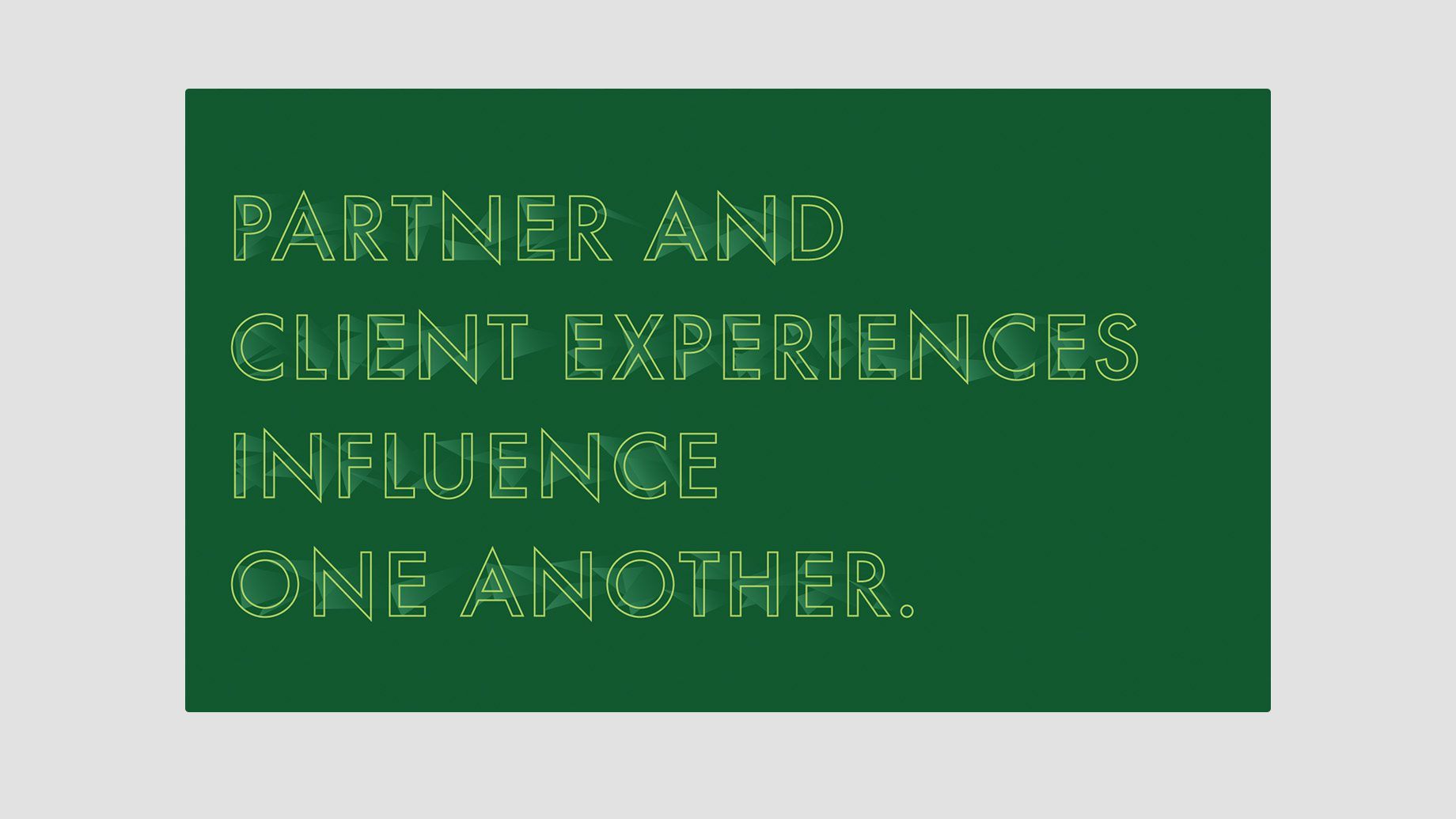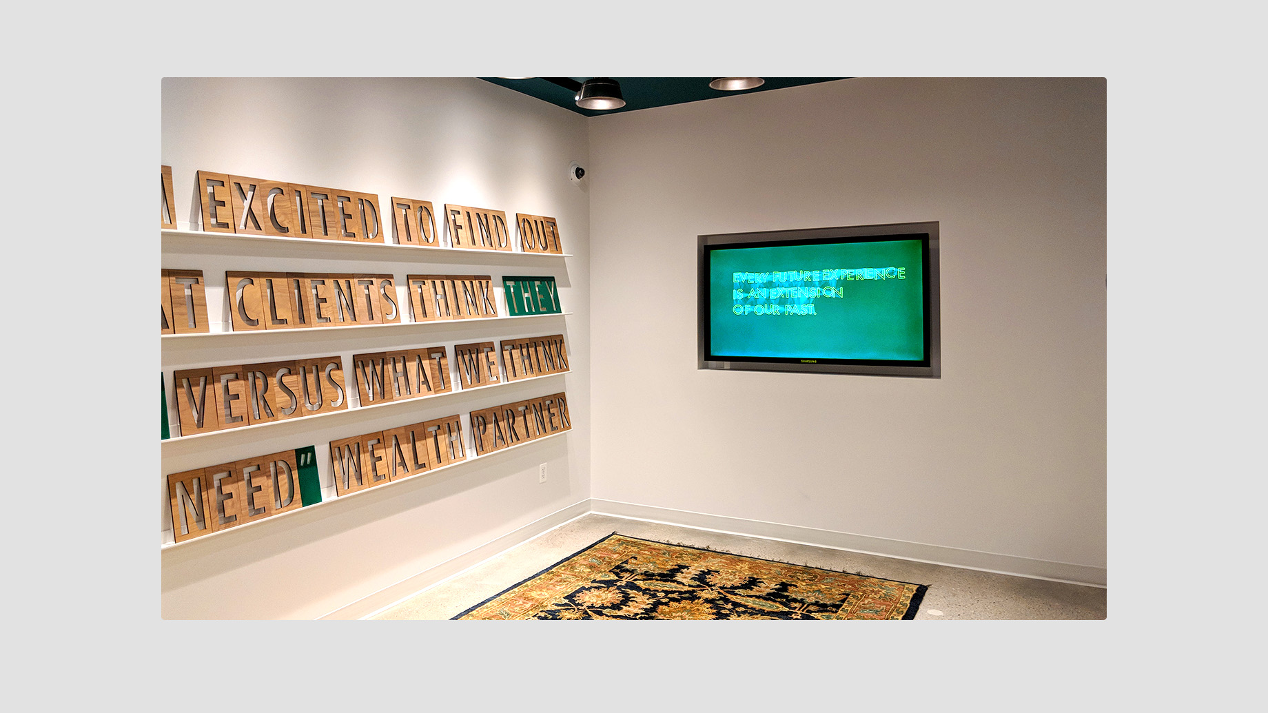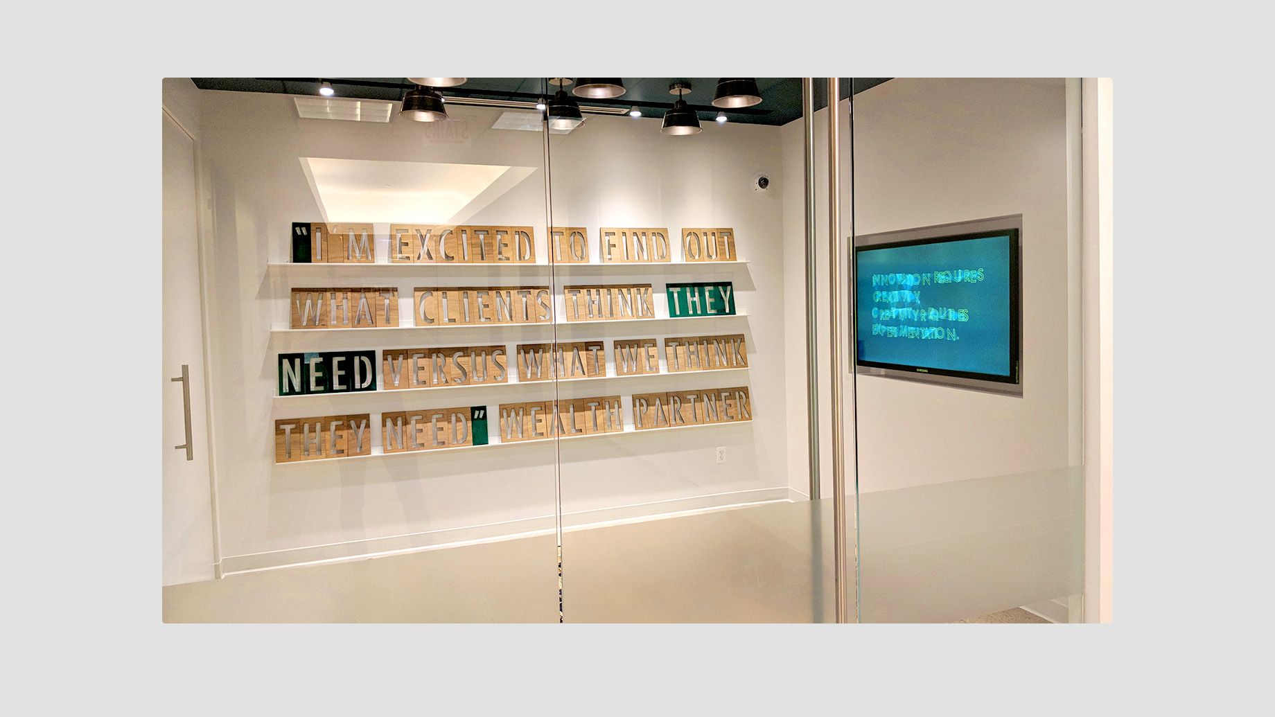 Our goal was to find a way for the space to feel fresh and unique within the organization but feel very human and grounded in the work and principles that The Lab would be embodying. The result was the pairing of a very analog installation of periodically rotating client/partner research quotes with a digital experience highlighting design principles and projects. This pairing really reflects the work of The Lab–rooted in research and experience but often carried into the digital realm for implementation and realization.