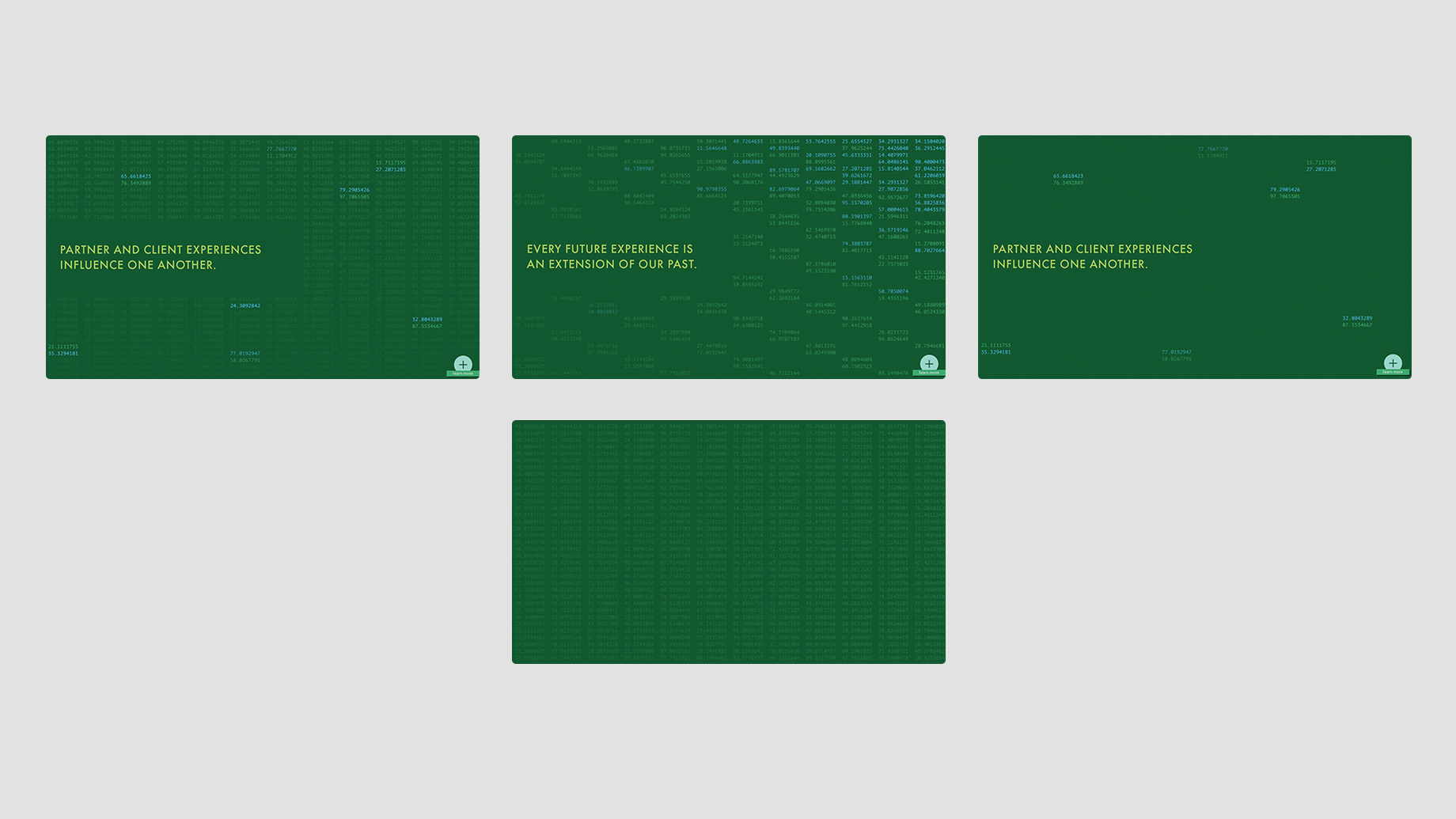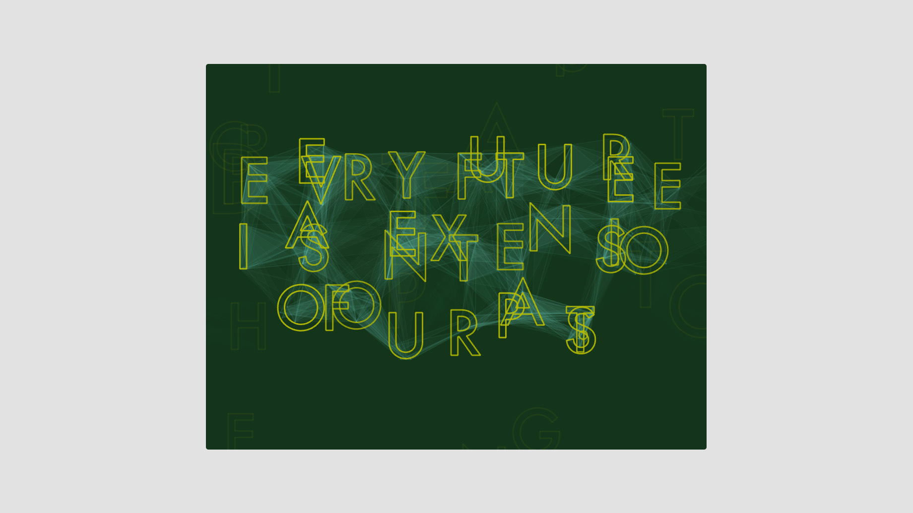 The digital experience features a sea of drifting letterforms with gossamer connections based on proximity. These letters periodically self-organize into the studio's design principles before drifting apart once again into their ambient drifting state.