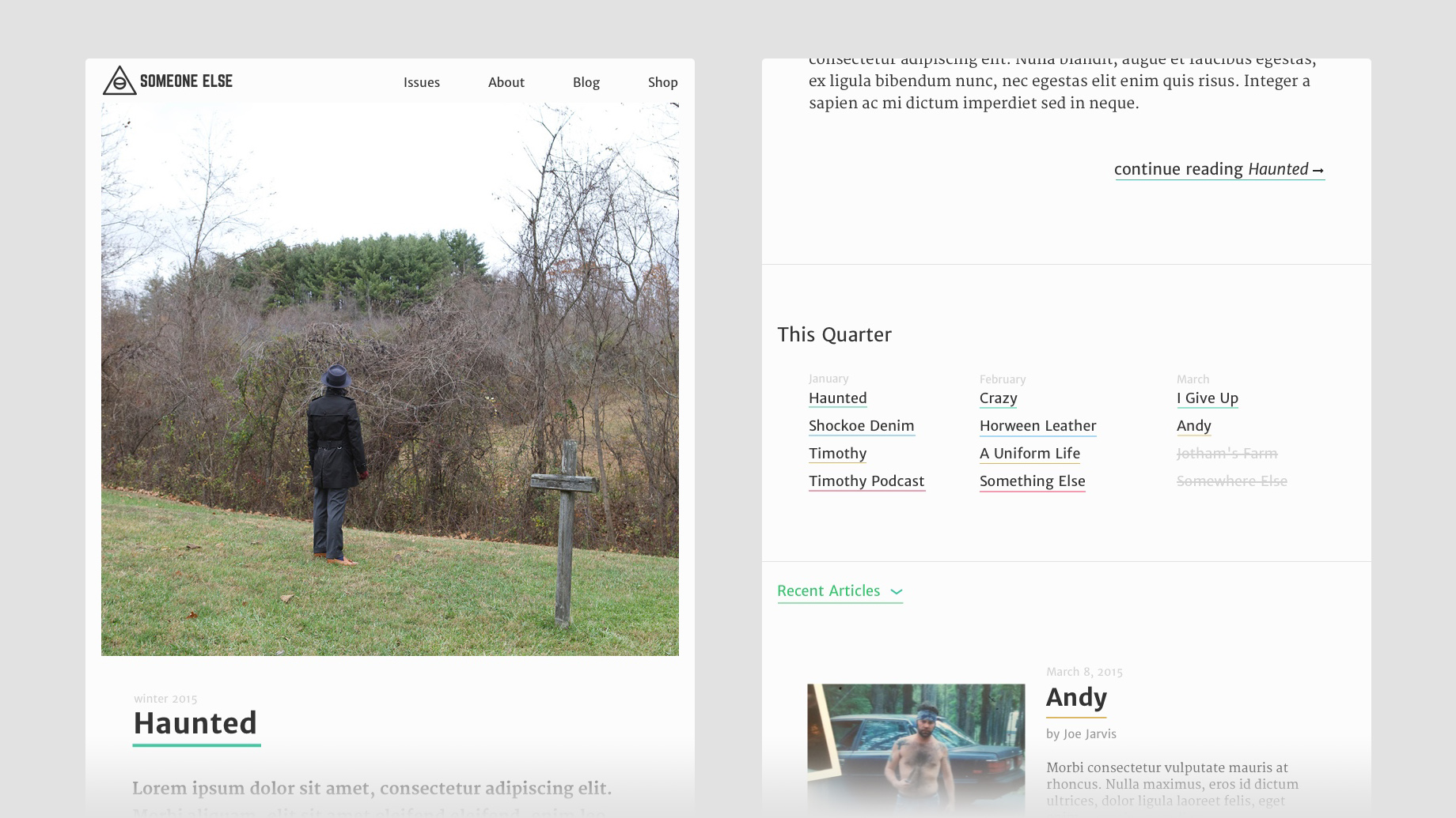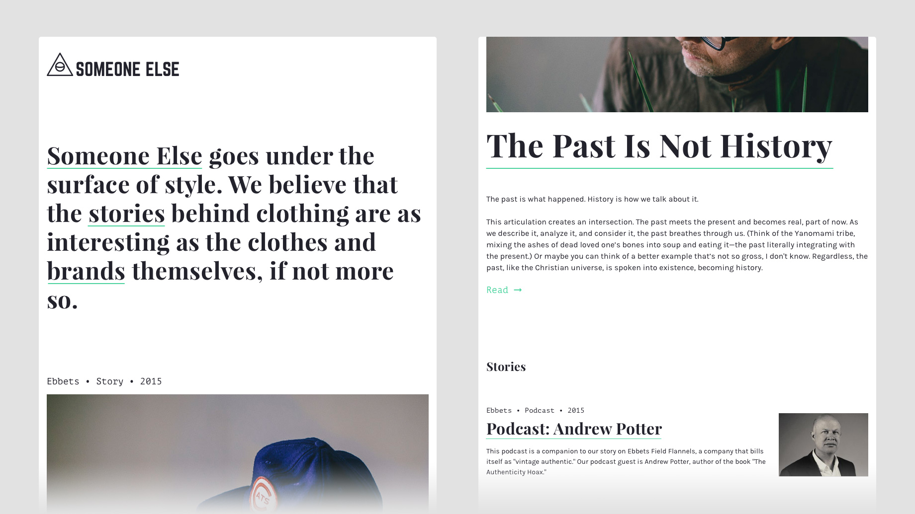 Someone Else sprang from Joe Jarvis' passion and curiosity for the why behind independent fashion and style. We work hard to marry a slow-journalism approach to writing with design and photography, treating it all as a singular, nuanced product.
