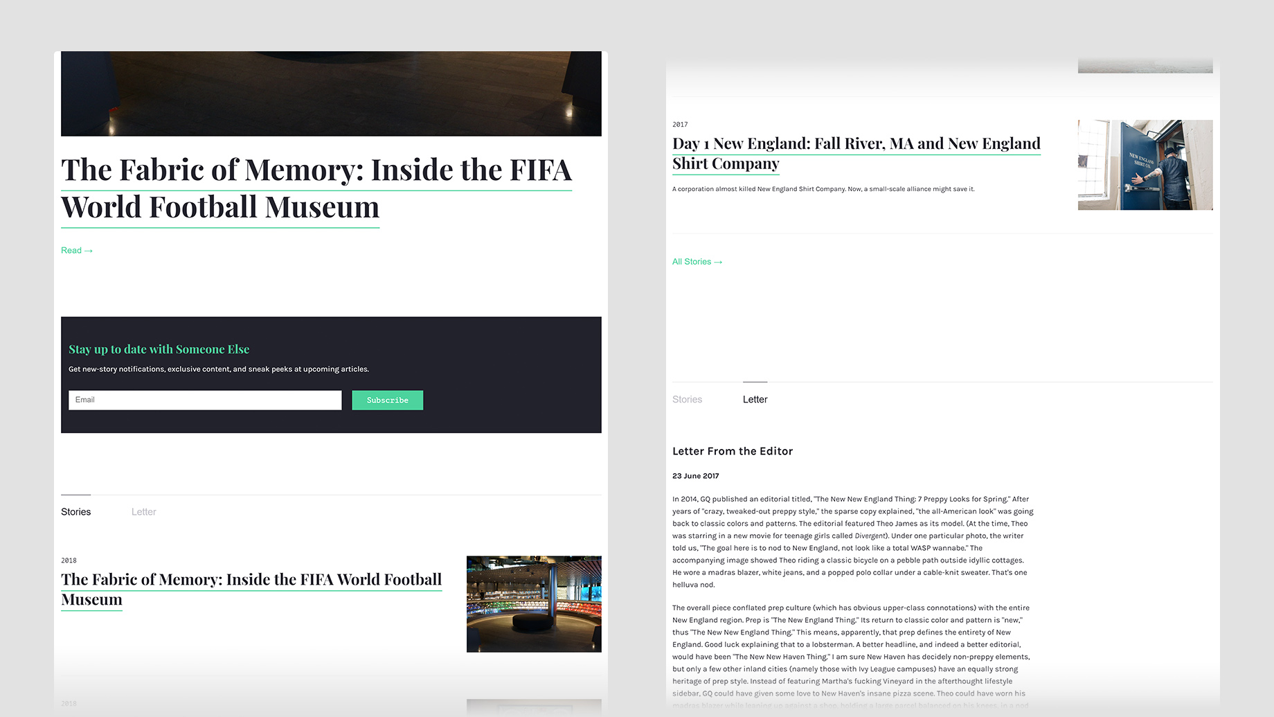 To this end the design and aesthetic seek to place the content at the fore and eschew armature and artifice where possible. Designed without feeling design-y. It was, however important to us that the layout of content for individual stories have the flexibility to break out of the typical wall of text with an occasional photo that has become such the hallmark of articles online (cough Medium cough). I created a robust admin dashboard experience the provides a great deal of editorial layout control with regards to splitting out content into columns and providing various formatting controls.