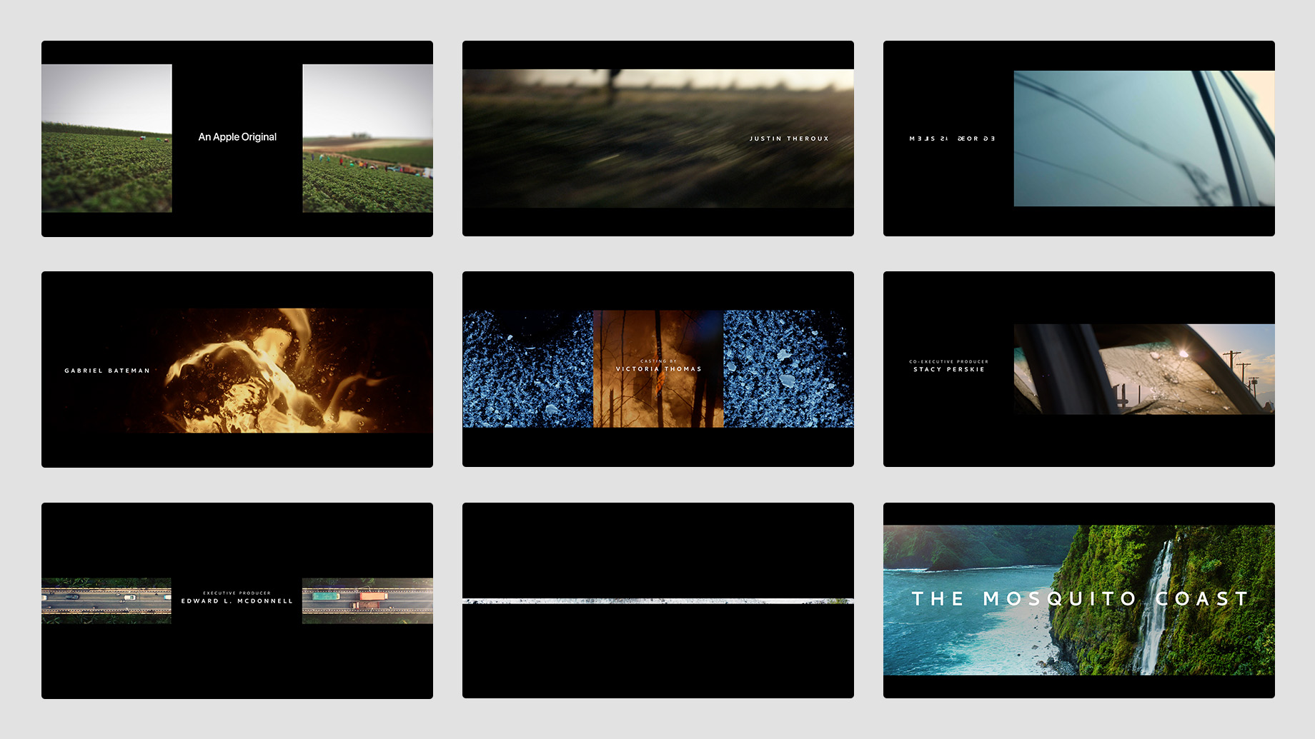 Adapted for a television series by Neil Cross and Tom Bissell, The Mosquito Coast tells the story of a family on the run. Each member of the family has their own motivations and subplots that all act in concert or tension with the family patriarch’s (Justin Theroux) genius, idealism, and history. It was important to capture within the title sequence this sense of interweaving stories and ratcheting tension.