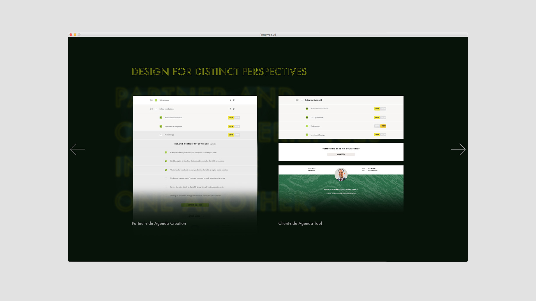 Touching the screen will take a viewer into a presentation mode where they can click through examples of work and process tied to the specific principles.