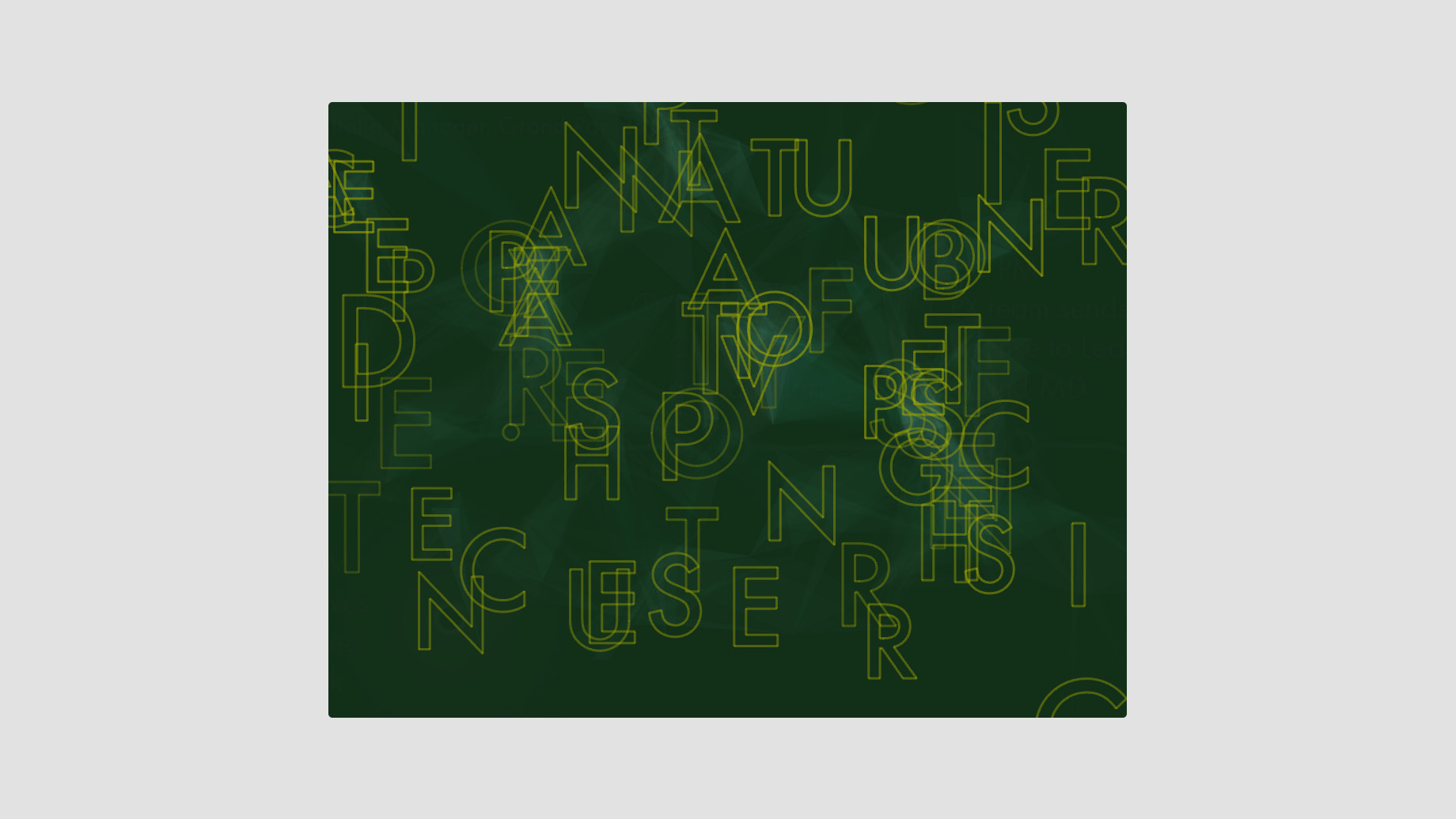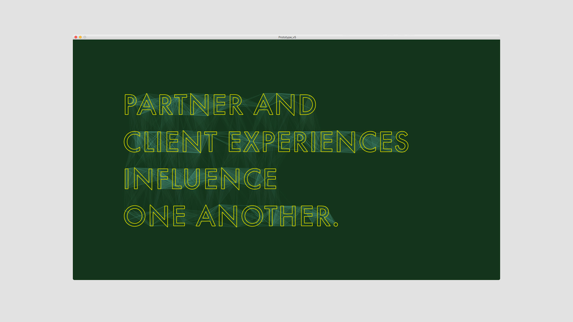 The digital experience features a sea of drifting letterforms with gossamer connections based on proximity. These letters periodically self-organize into the studio's design principles before drifting apart once again into their ambient drifting state.